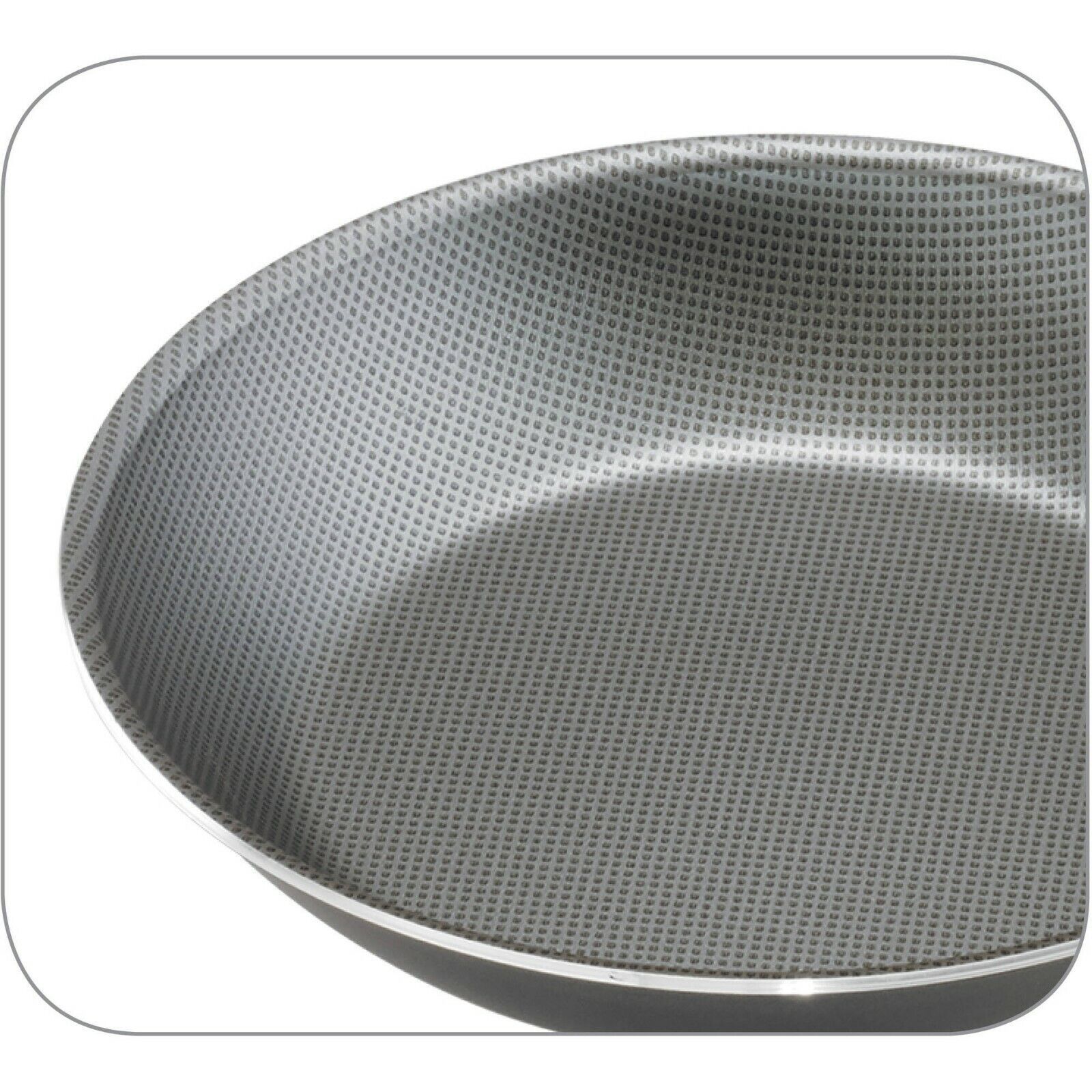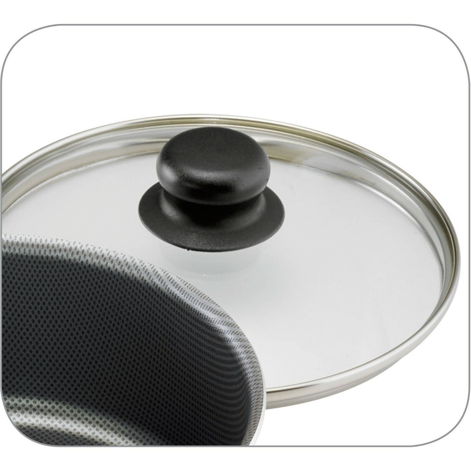 Tramontina PrimaWare 18-Piece Nonstick Cookware Set:Complete cookware set with patterned gray interior nonstick coating for easy cooking and cleaningRiveted; stay-cool handlesHeat- and shatter-resistant tempered glass lids allow easy monitoring of cooking progressDishwasher-safeCompatible with gas; electric and ceramic glass cooktopsProduct description