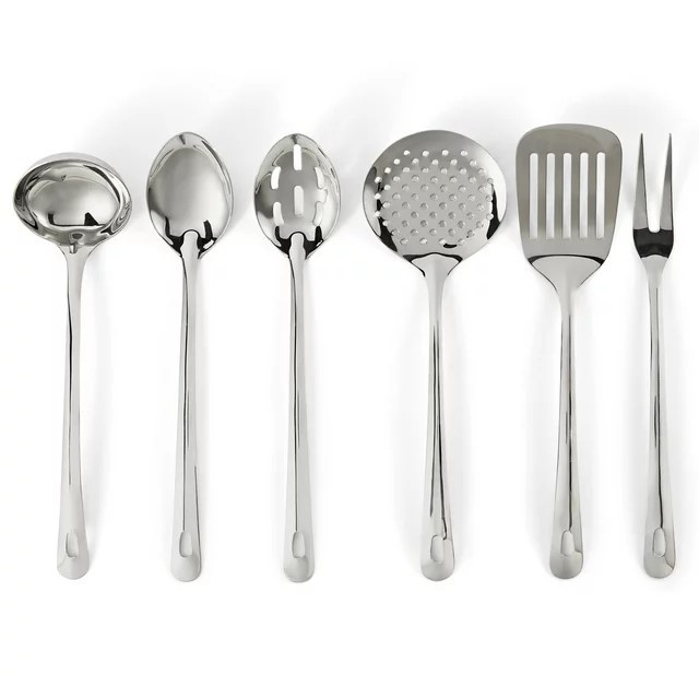 This bright and shiny set includes sauté pans, sauce pans, a Dutch oven, a colander, utensils, storage canisters, storage bowls, measuring cups, measuring spoons, and flatware service for 4. These pots and pans are oven safe to 450 degrees Fahrenheit so you can roast or braise foods in the oven as well as cook favorite recipes on the stovetop. It's a great way to outfit your kitchen from scratch.