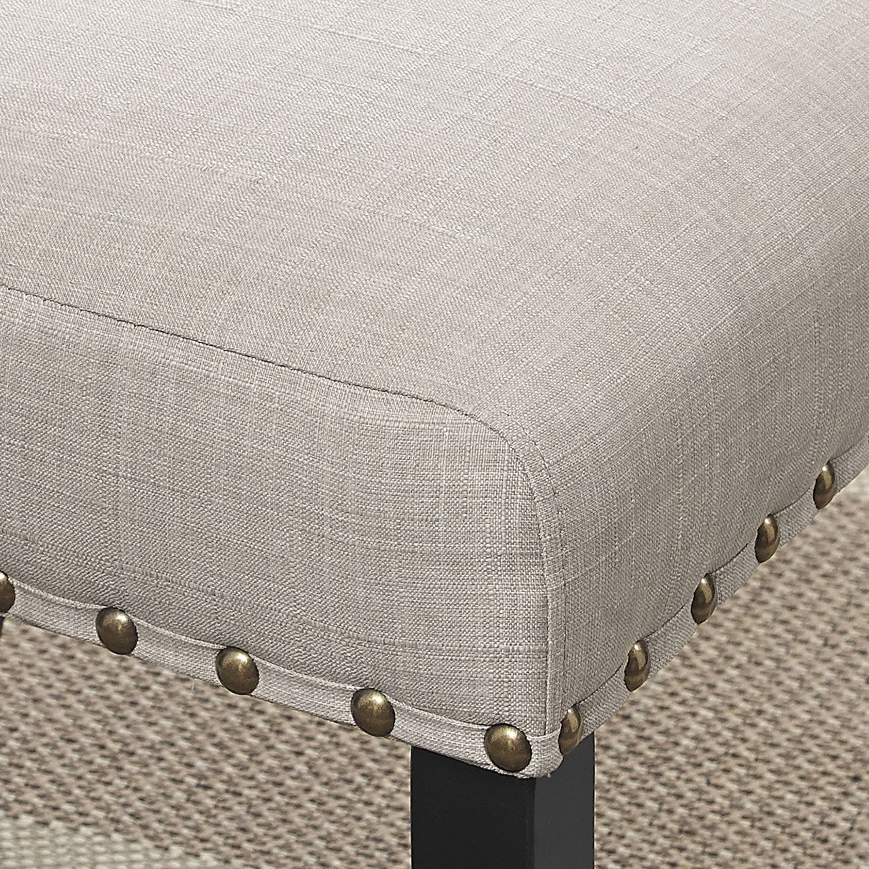 HIGHLIGHTS: The dining table features a metallic hairpin design, which adds both stability and style. It has a rustic dark pine finish and showcases a natural wood grain texture, offering an elegant look. The chairs feature fabric upholstery with brass nailheads, adding texture and visual appeal.
