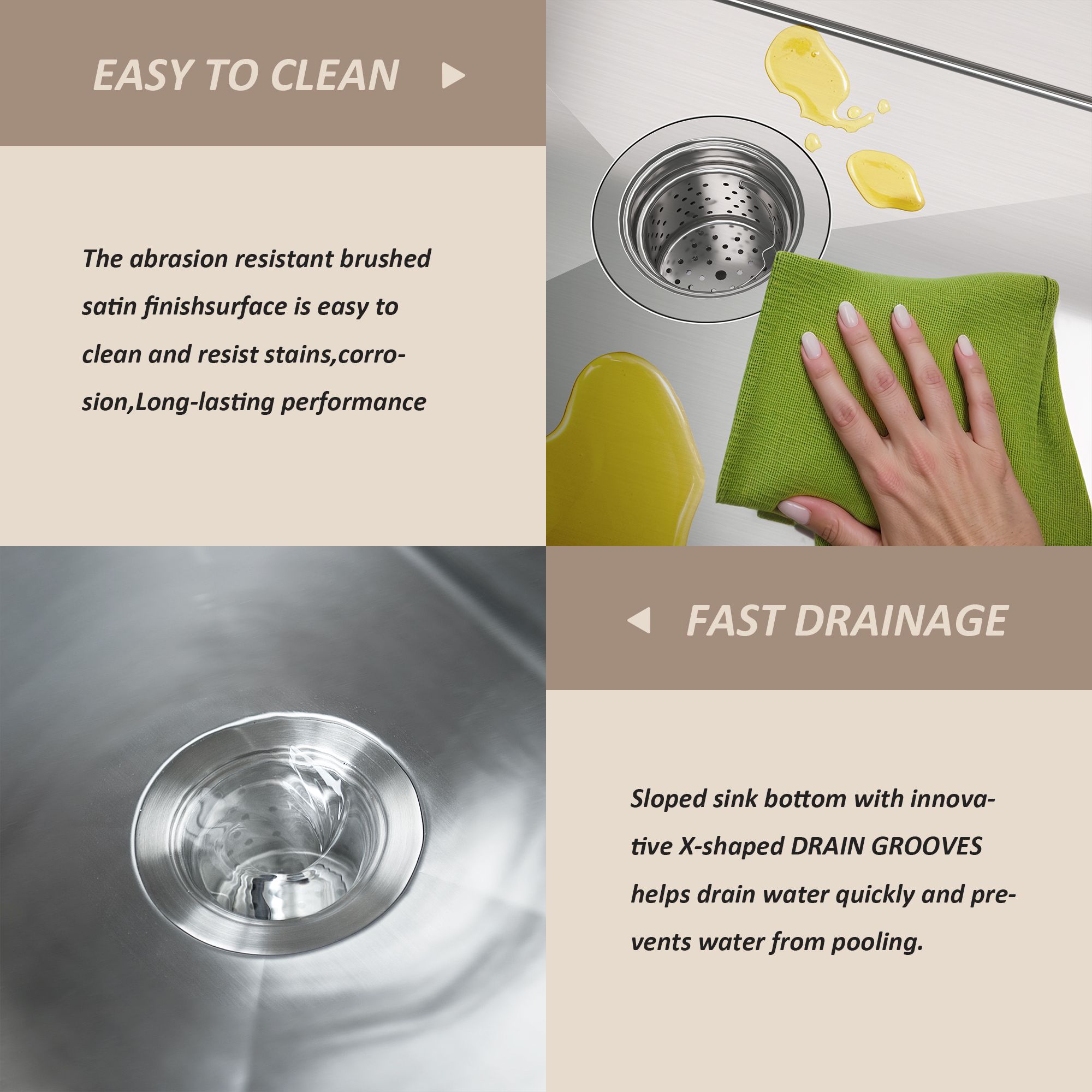 1.INDUSTRIAL LEVEL PREMIUM STAINLESS STEEL: Handcrafted kitchen sinks utilizing 16 Gauge (1.5 mm thick) T304 stainless steel for the superior durability and dent-resistance. Best material selection making sure the sink will last longer than most other tools in your kitchen even under most heavy usage. Brushed satin finishes preventing rusts and scratches.