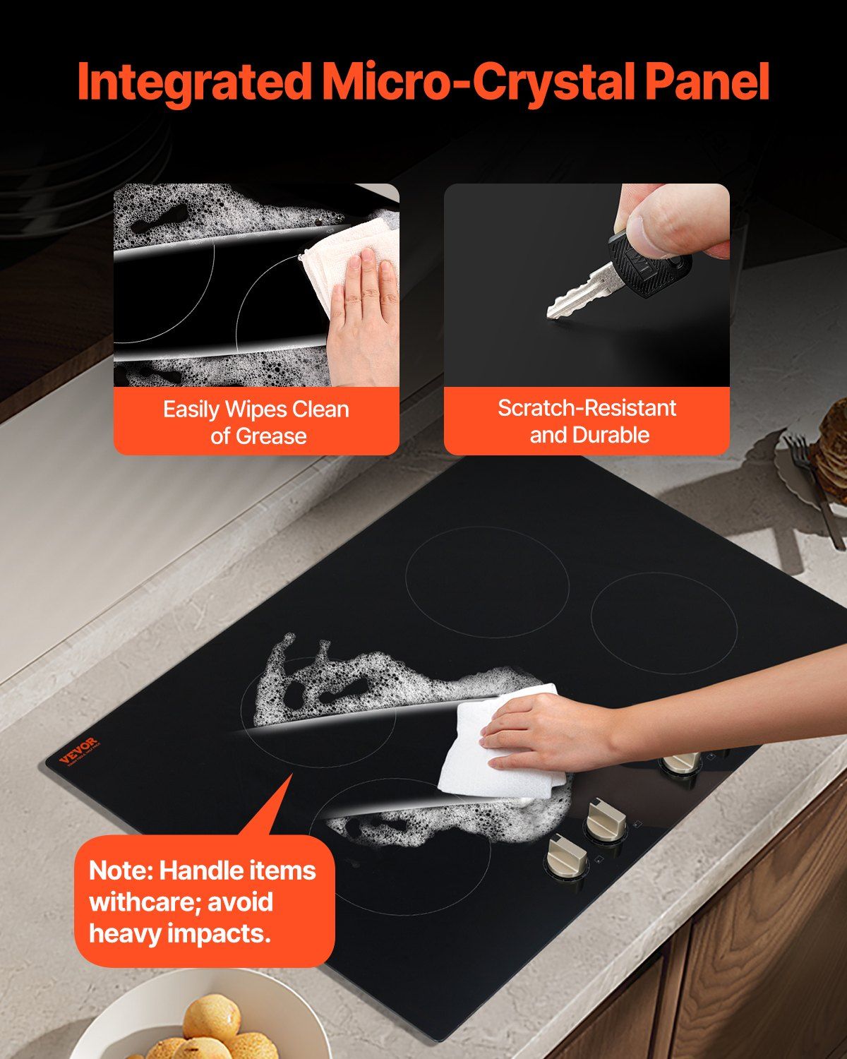 Highlights: 1.High-Powered Induction Cooktop: The 6600W built-in electric stove offers fast and even heating, with 12 adjustable power levels, making it ideal for stewing, frying, simmering, steaming, boiling, sautéing, and roasting. With 4 cooking zones, you can cook efficiently and use a wide range of compatible cookware. 2.Compatible with Multiple Cookware: This electric countertop burner has high compatibility with various heat-resistant cookware types, such as cast iron and stainless steel, helping to reduce heat loss. 3.Note: Only cookware with magnetic properties can be used on this induction cooktop. 4.Knob Control: With simple, easy-to-use knob controls, this kitchen induction cooktop lets you quickly adjust to the perfect heat level. Each knob can independently control the temperature for flexible cooking, making holiday meals like Christmas, Thanksgiving, Easter, and other special occasions easier than ever. 5.Safety Features: This electric stove top includes automatic shut-off, over- and under-voltage protection, temperature control, and residual heat indicators to keep cooking safe. It's designed for peace of mind, making it safe for use by pregnant women, elderly individuals, and families.