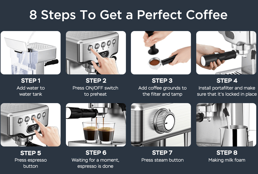 Powerful milk steamer: an espresso machine with a milk foam machine has a stable steam bar that can turn the milk into a silky, smooth microfoam. Latte coffee machine for you to create latte, cappuccino, mocha or pure white coffee art at home or office. The detachable foaming nozzles make cleaning easy.