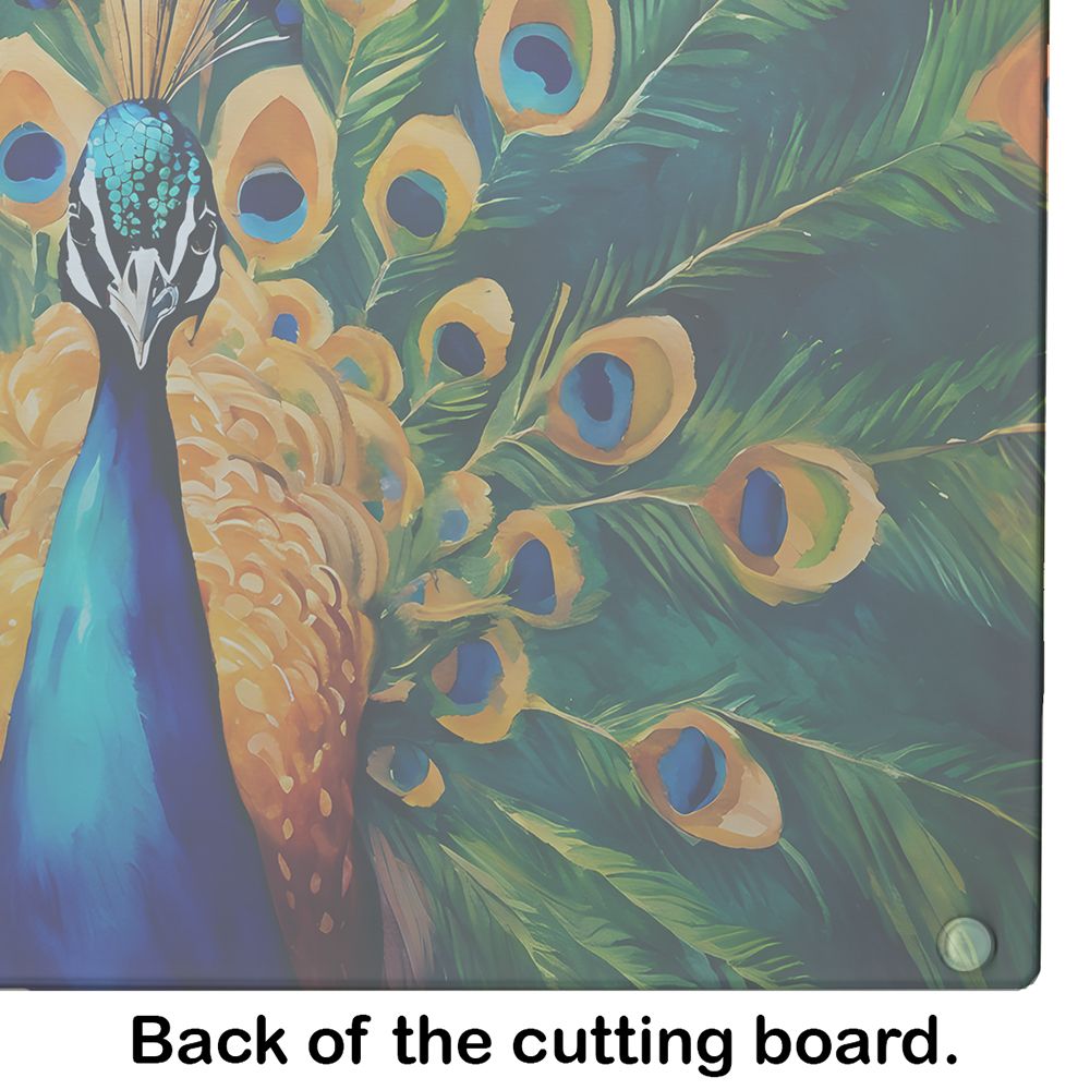 Glass Cutting Board featuring breed specific Peacock artwork. Introduce your kitchen to the vibrant, large Decorative Glass Cutting Board from Caroline's Treasures. Crafted from resilient tempered glass, this board is not only a utilitarian necessity but also a colorful art piece. With its generous dimensions of 15 inches in height and 12 inches in length, it offers ample space for all your cutting needs. Every piece showcases captivating artwork from distinguished artists, bringing an aesthetic edge to your kitchen. Beyond its attractive design, this cutting board ensures your countertop stays pristine and unscathed, owing to its heat-resistant properties. Engineered with user convenience in mind, it features non-skid feet for stability, and rounded corners for additional safety. Its robust construction renders it virtually unbreakable, guaranteeing longevity. The board comes with protective feet bumpers, maintaining its position during use. This product is recommended to be hand washed only. Proudly printed and assembled in the United States, this cutting board exemplifies superior craftsmanship. With Caroline's Treasures' Decorative Glass Cutting Board, you're investing in a blend of functionality and artistic flair.