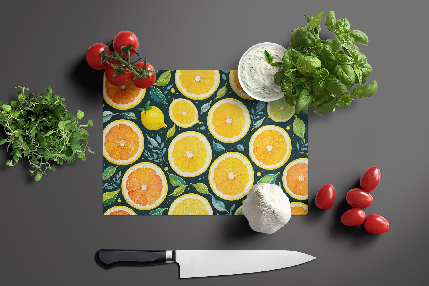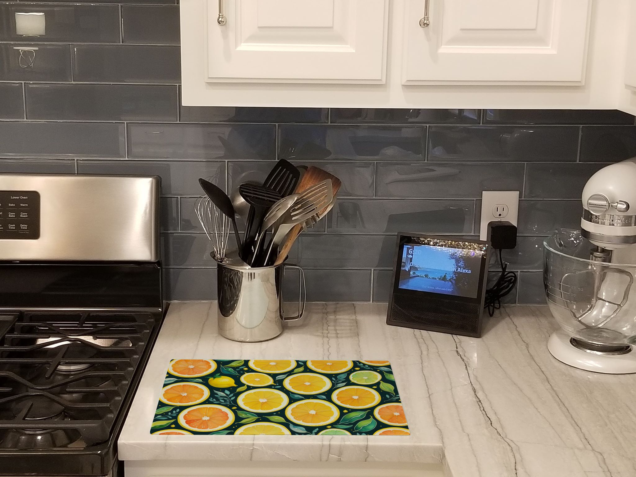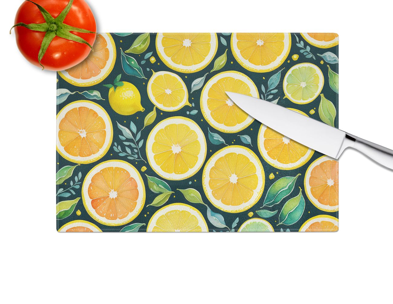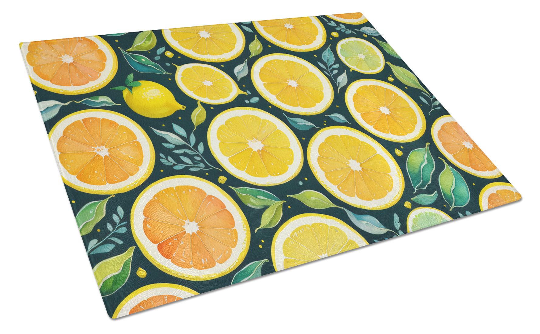 Glass Cutting Board featuring breed specific Lemons artwork. Introduce your kitchen to the vibrant, large Decorative Glass Cutting Board from Caroline's Treasures. Crafted from resilient tempered glass, this board is not only a utilitarian necessity but also a colorful art piece. With its generous dimensions of 15 inches in height and 12 inches in length, it offers ample space for all your cutting needs. Every piece showcases captivating artwork from distinguished artists, bringing an aesthetic edge to your kitchen. Beyond its attractive design, this cutting board ensures your countertop stays pristine and unscathed, owing to its heat-resistant properties. Engineered with user convenience in mind, it features non-skid feet for stability, and rounded corners for additional safety. Its robust construction renders it virtually unbreakable, guaranteeing longevity. The board comes with protective feet bumpers, maintaining its position during use. This product is recommended to be hand washed only. Proudly printed and assembled in the United States, this cutting board exemplifies superior craftsmanship. With Caroline's Treasures' Decorative Glass Cutting Board, you're investing in a blend of functionality and artistic flair.