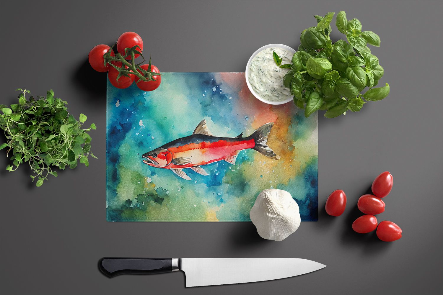Glass Cutting Board featuring breed specific Salmon artwork. Introduce your kitchen to the vibrant, large Decorative Glass Cutting Board from Caroline's Treasures. Crafted from resilient tempered glass, this board is not only a utilitarian necessity but also a colorful art piece. With its generous dimensions of 15 inches in height and 12 inches in length, it offers ample space for all your cutting needs. Every piece showcases captivating artwork from distinguished artists, bringing an aesthetic edge to your kitchen. Beyond its attractive design, this cutting board ensures your countertop stays pristine and unscathed, owing to its heat-resistant properties. Engineered with user convenience in mind, it features non-skid feet for stability, and rounded corners for additional safety. Its robust construction renders it virtually unbreakable, guaranteeing longevity. The board comes with protective feet bumpers, maintaining its position during use. This product is recommended to be hand washed only. Proudly printed and assembled in the United States, this cutting board exemplifies superior craftsmanship. With Caroline's Treasures' Decorative Glass Cutting Board, you're investing in a blend of functionality and artistic flair.