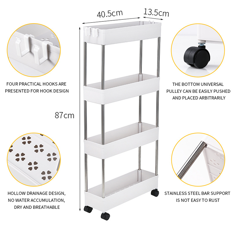 1. The 4-storey ultra-thin structure design of shopping cart can be placed in any small space in your home, including closet, kitchen, bathroom, garage, laundry room, office or between washing machine and dryer