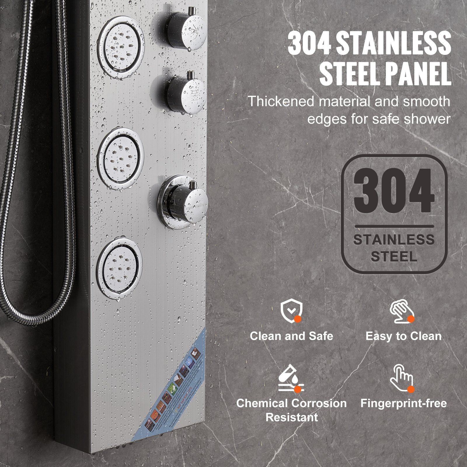 4.304 Stainless Steel Material: Crafted from high-quality 304 stainless steel for safety and durability. The shower panel tower is thick and resistant to fingerprints, rust, and corrosion. Ensuring easy cleaning for lasting beauty and hygiene.