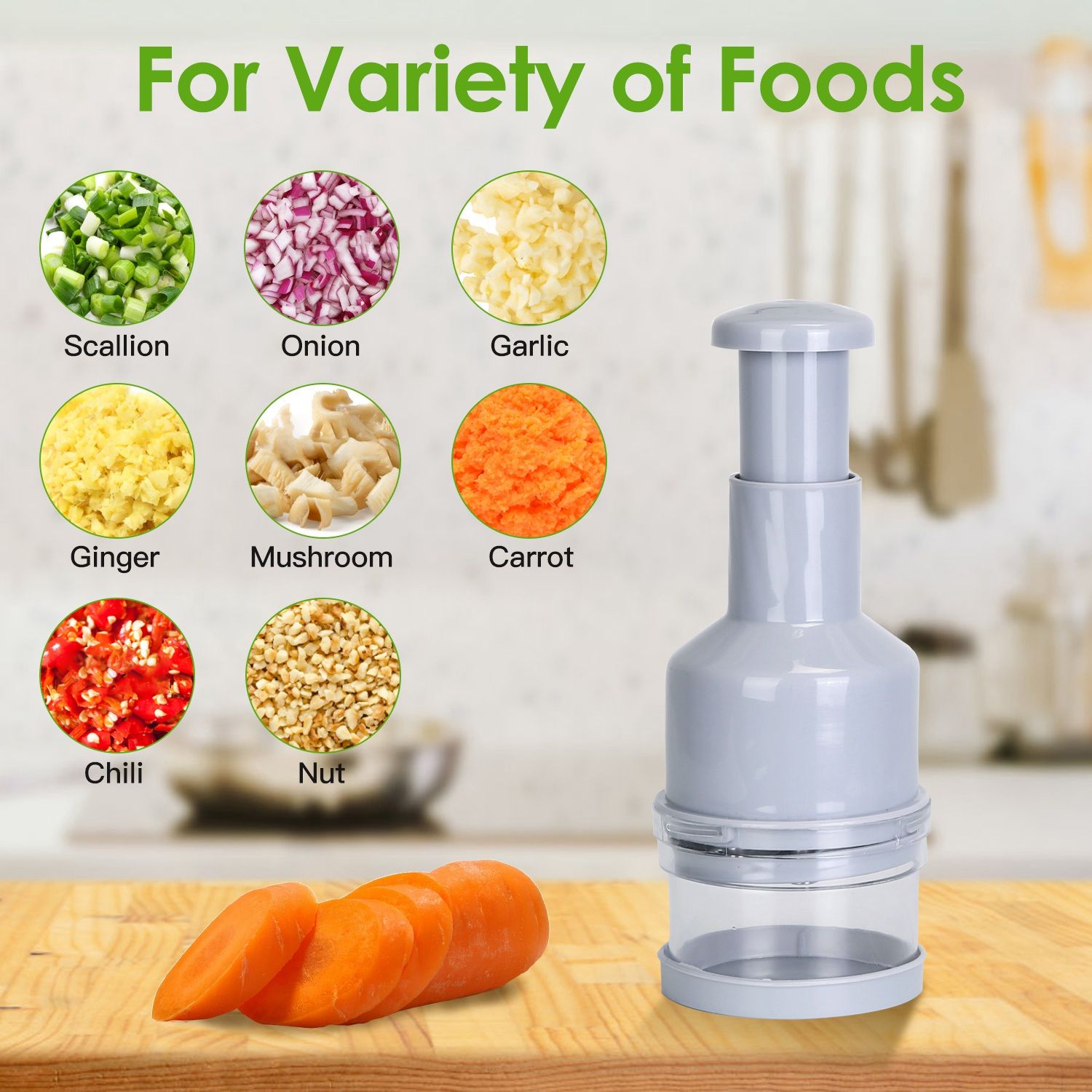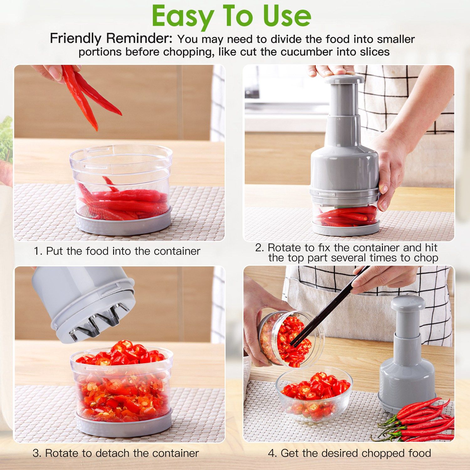 *Easy To Use*:Simply put the food into the container and hit/slap the top part several times to use. The inner stainless-steel blade will turn 24-degree per chop to help you get faster chopping,mincing dicing and grinding than a knife. The more you hit,the finer the food will be. Note:You may need to divide the food into smaller portions before chopping,like cut an onion into quarters before chopping.