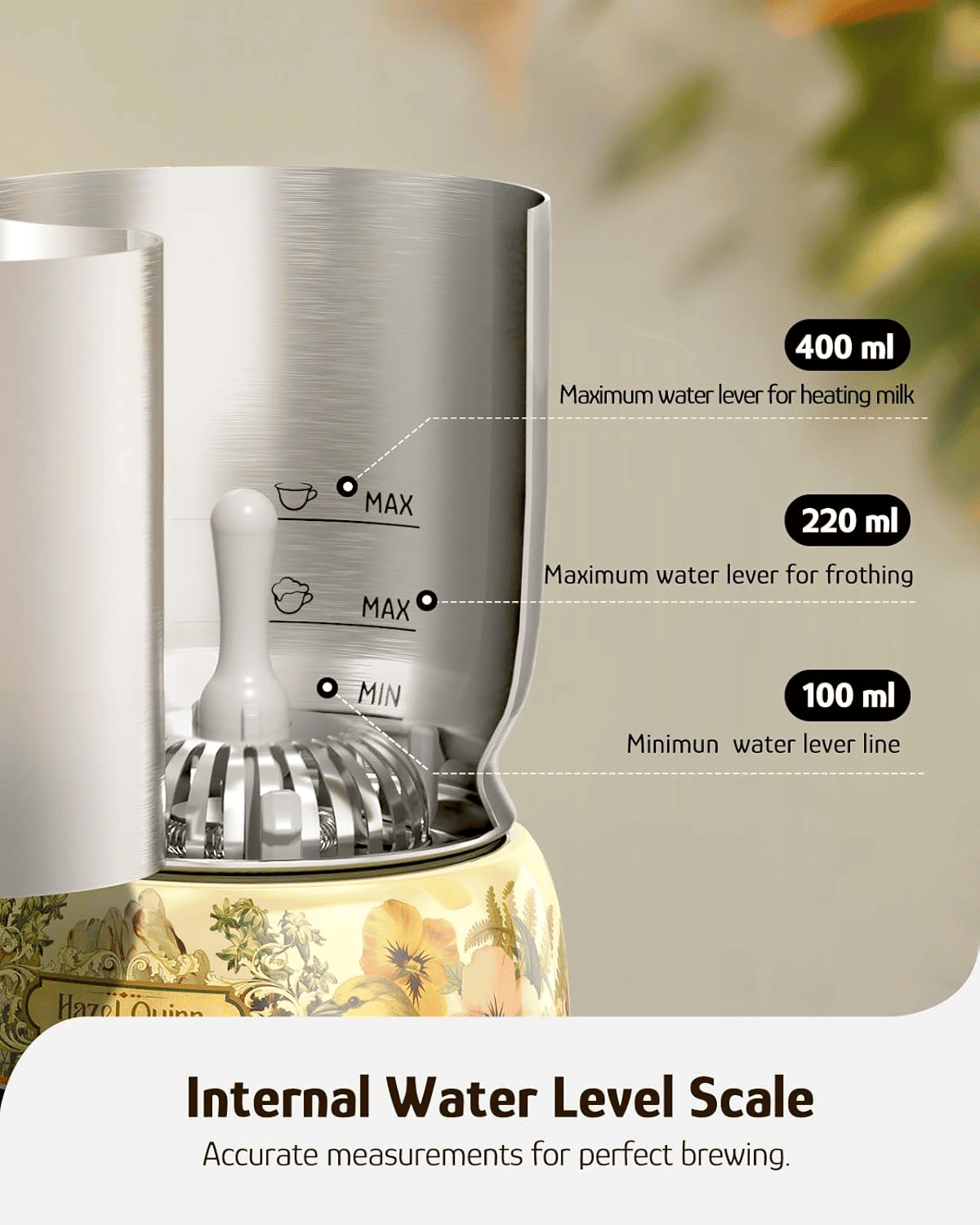 [Super Large 13.5 oz / 400 ml capacity] -Use Hazel Quinn's 13.5 oz / 400 ml kettle capacity to release your creativity. The cup is equipped with double "maximum" waterlines-a higher water line for heating function, and a slightly lower water line for foaming, providing accuracy for making the perfect drink.