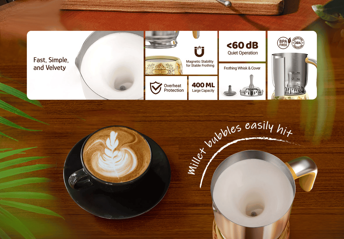 [304 Stainless Steel] -The water can is made from a 304 stainless steel inside, and this Hazel Quinn milk foam device ensures a BPA-free drinking experience and avoids any plastic contact with water. Give priority to durability and purity to protect your health.