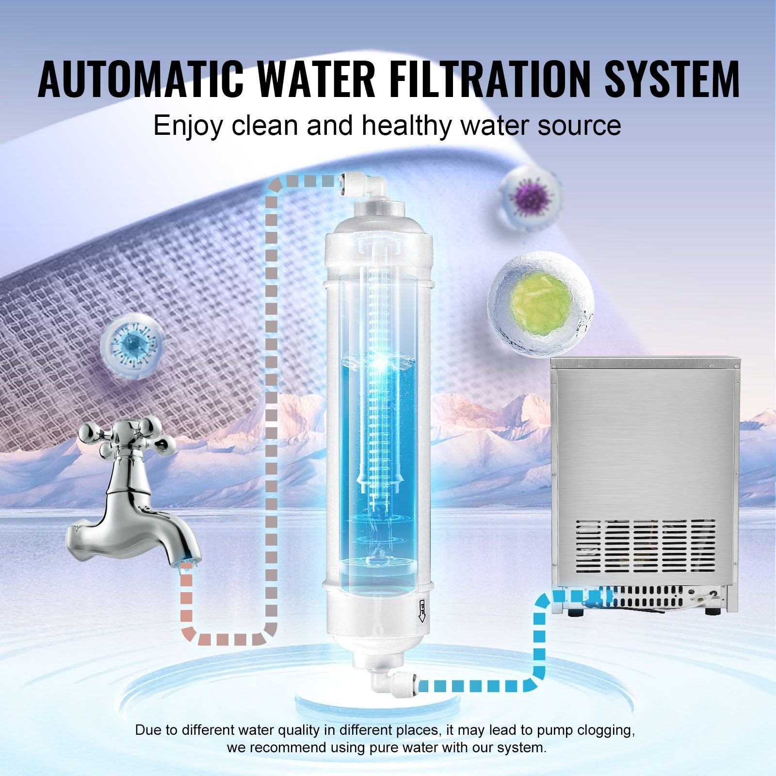 4.Make Cleaning a Breeze: Our ice machine comes with a one-touch self-cleaning function and a supplied water filter in the inlet pipe. Say goodbye to worries about impurities in your ice. Our state-of-the-art filtration system removes any unwanted particles, ensuring that only pure, clean water is used. It's not just ice - it's ice you can trust!