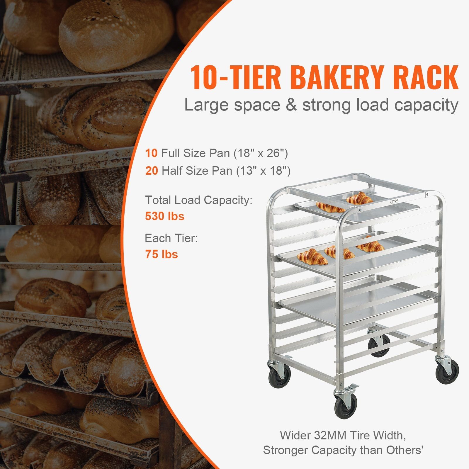 > VEVOR Bun Pan Rack, 10-Tier Commercial Bakery Racks with Brake Wheels, Aluminum Racking Trolley Storage for Half & Full Sheet, Speed Rack For Kitchen