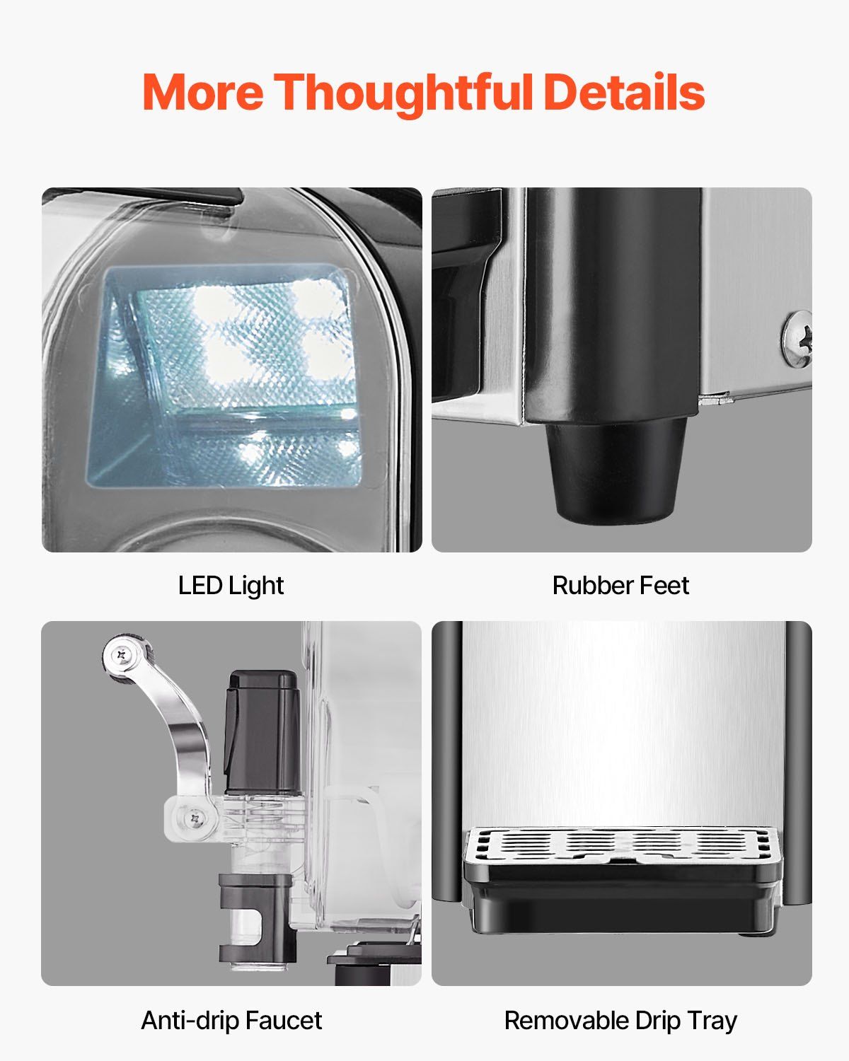 5.Additional Features: The slushy maker machine is equipped with a drip tray at the bottom to prevent water leakage, which can be removed for easy cleaning. The spring-loaded faucet ensures minimal water leakage after use. The three-sided ventilation design helps with quick heat dissipation, and the rubber feet provide non-slip stability during operation, ensuring better machine stability.