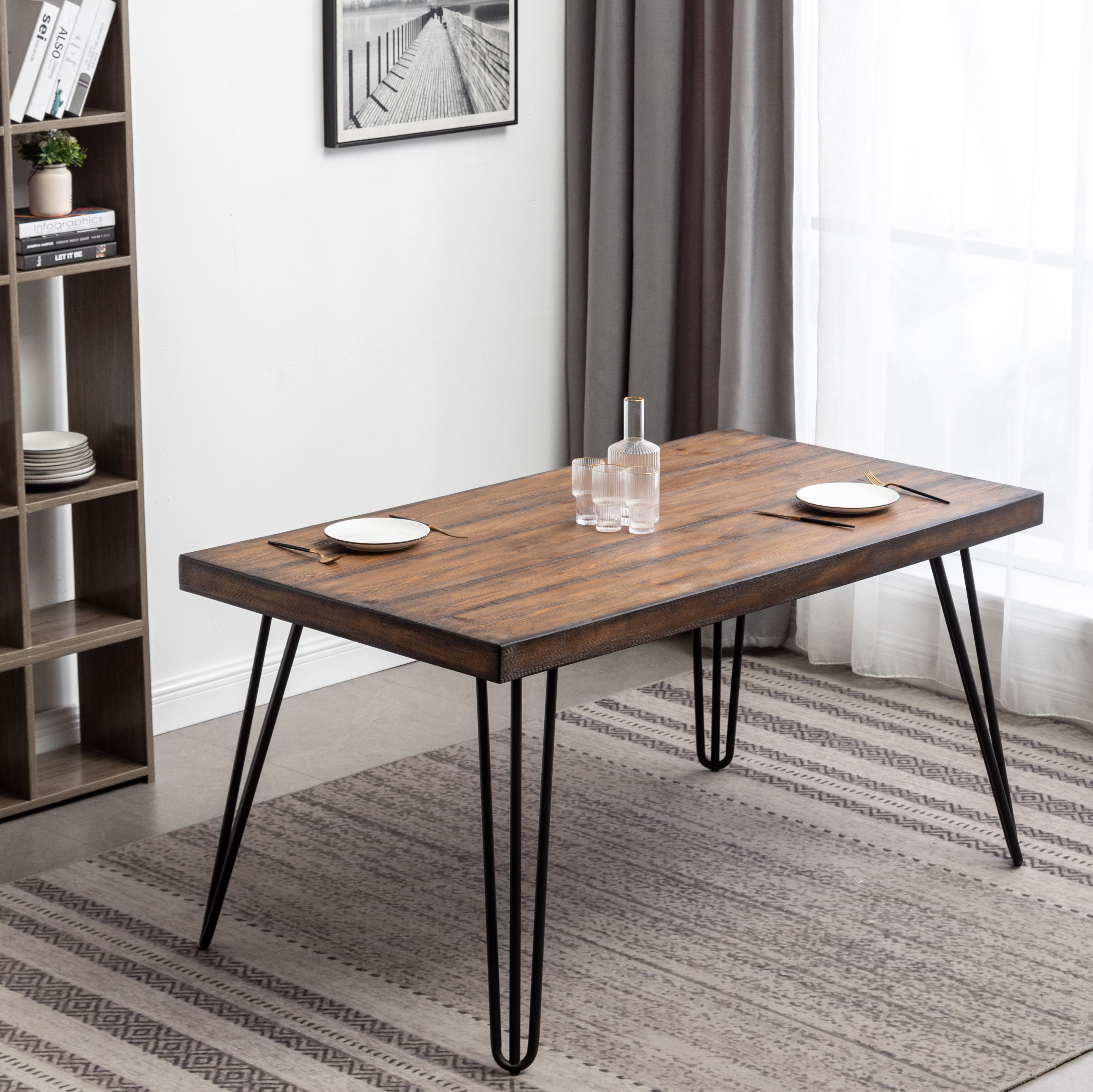 HIGHLIGHTS: The dining table features a metallic hairpin design, which adds both stability and style. It has a rustic dark pine finish and showcases a natural wood grain texture, offering an elegant look. The chairs feature fabric upholstery with brass nailheads, adding texture and visual appeal.