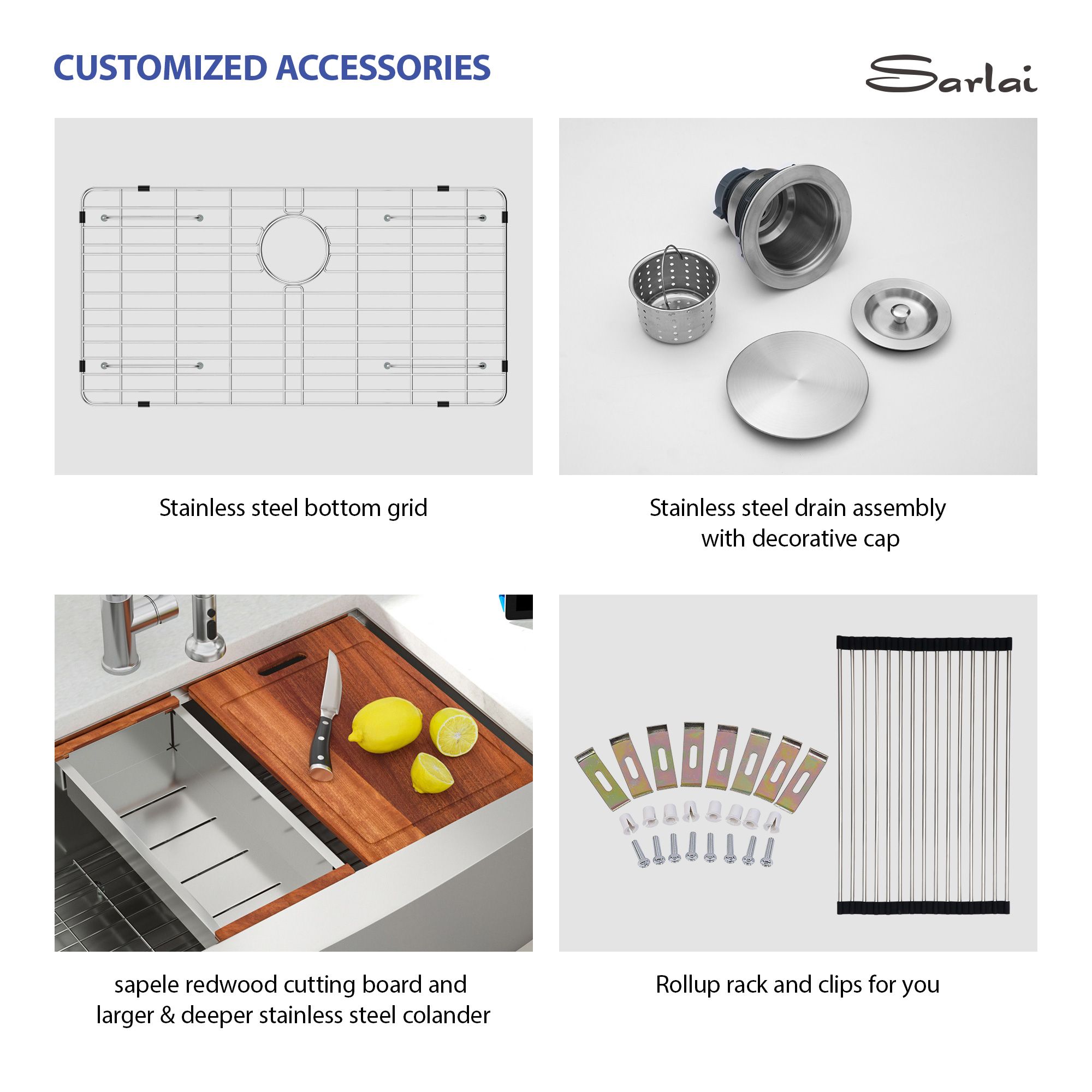 Package include: a apron front stainless steel kitchen sink, rolling drying rack, colander, cutting board(wood/redwood), stainless steel drain, bottom grid, mounting hardware and operation instruction.
