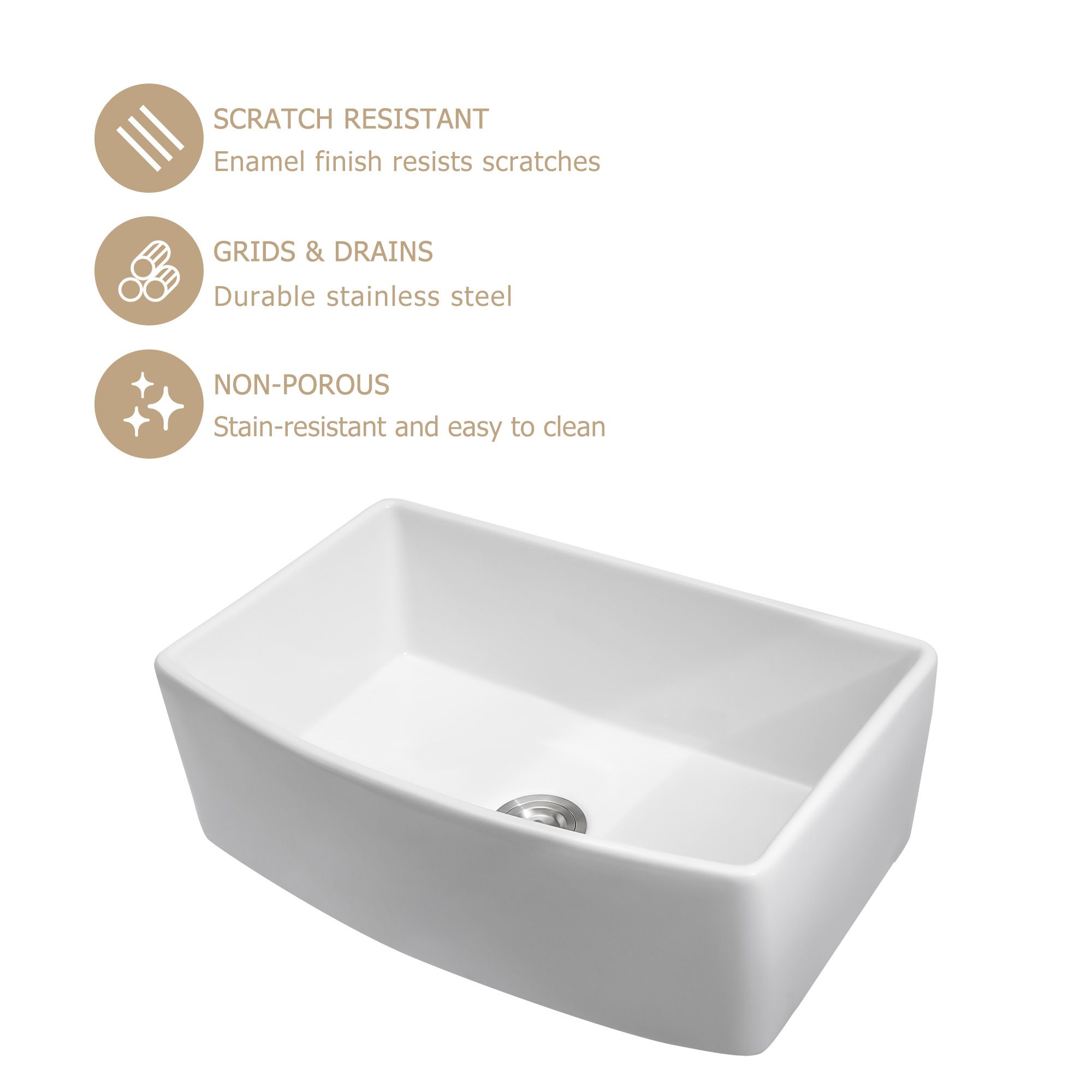 2.Easy to Clean: The smooth glazed surface and rounded corners with a radius of 20mm are easy to clean. High glossy glaze can perfectly resist stains and scratches, simply wipe this ceramic farmhouse kitchen sink surface with a damp cloth to keep it looking beautiful.