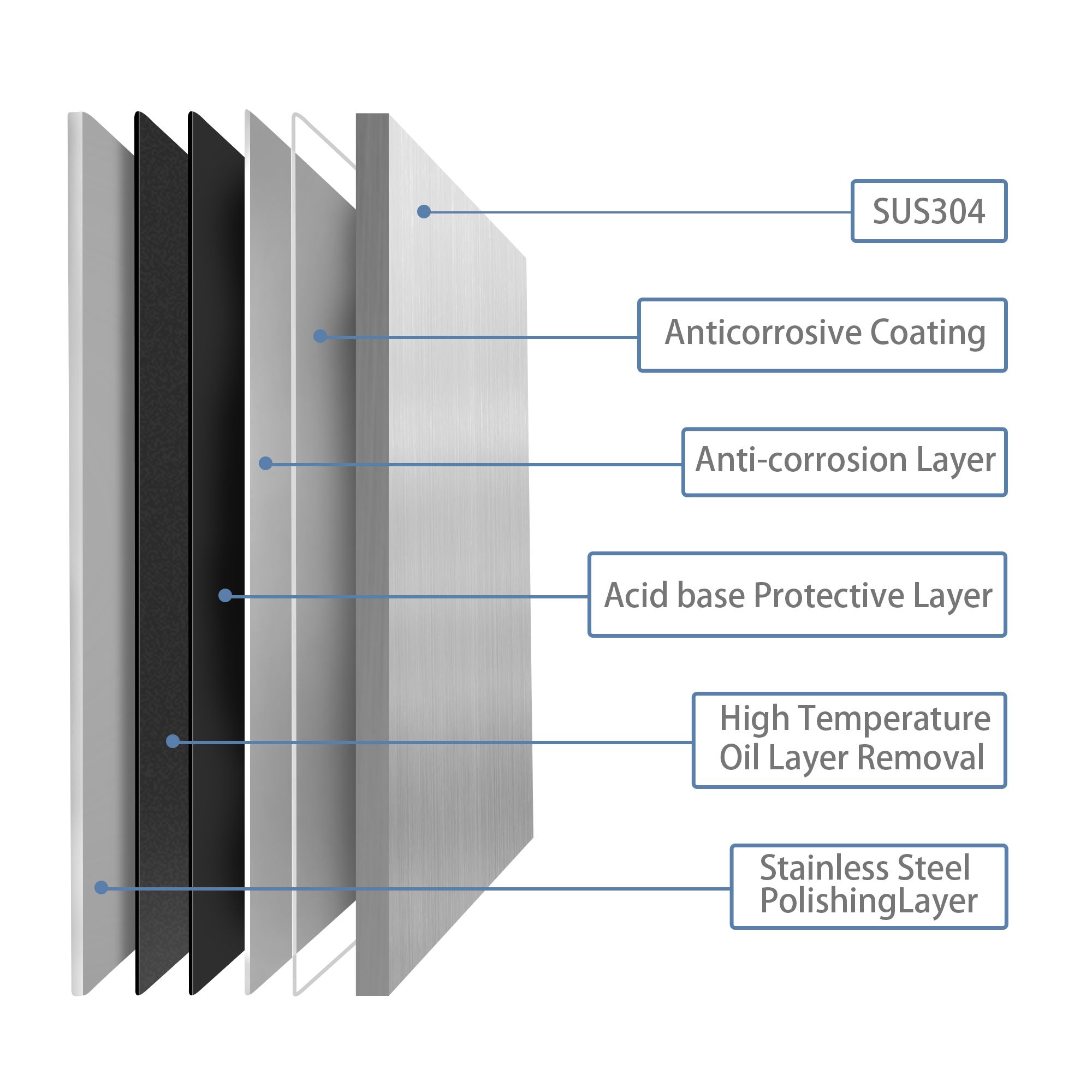 1.Handmade from premium 18-Gauge T-304 stainless steel for maximum durability,the corrosion-resistant surface is further protected from rust and oxidation by a meticulous finishing process.