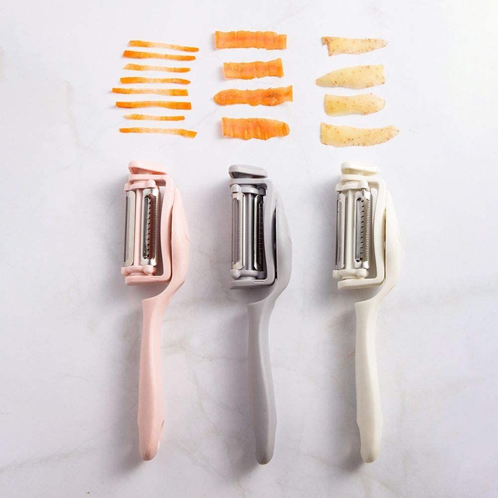 1.MULTI-FUNCTION FRUIT & VEGETABLE PEELER: Clockwise rotation adjustment with 3 blades by Serrated blade + Straight blade + Julienne blade. Serrated blade is mainly for soft skins like cucumbers, tomatoes, kiki fruit etc. Straight blade is mainly for skin removal. Julienne blade is helpful for same-si
